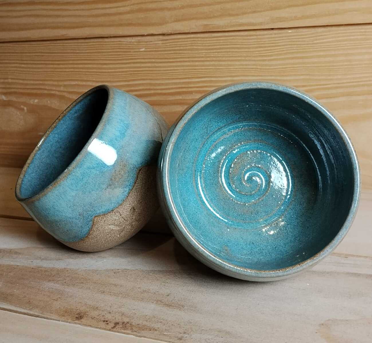 Ce bol spirale lagon en grès émaillé est une création artisanale façonnée à la main dans mon atelier.